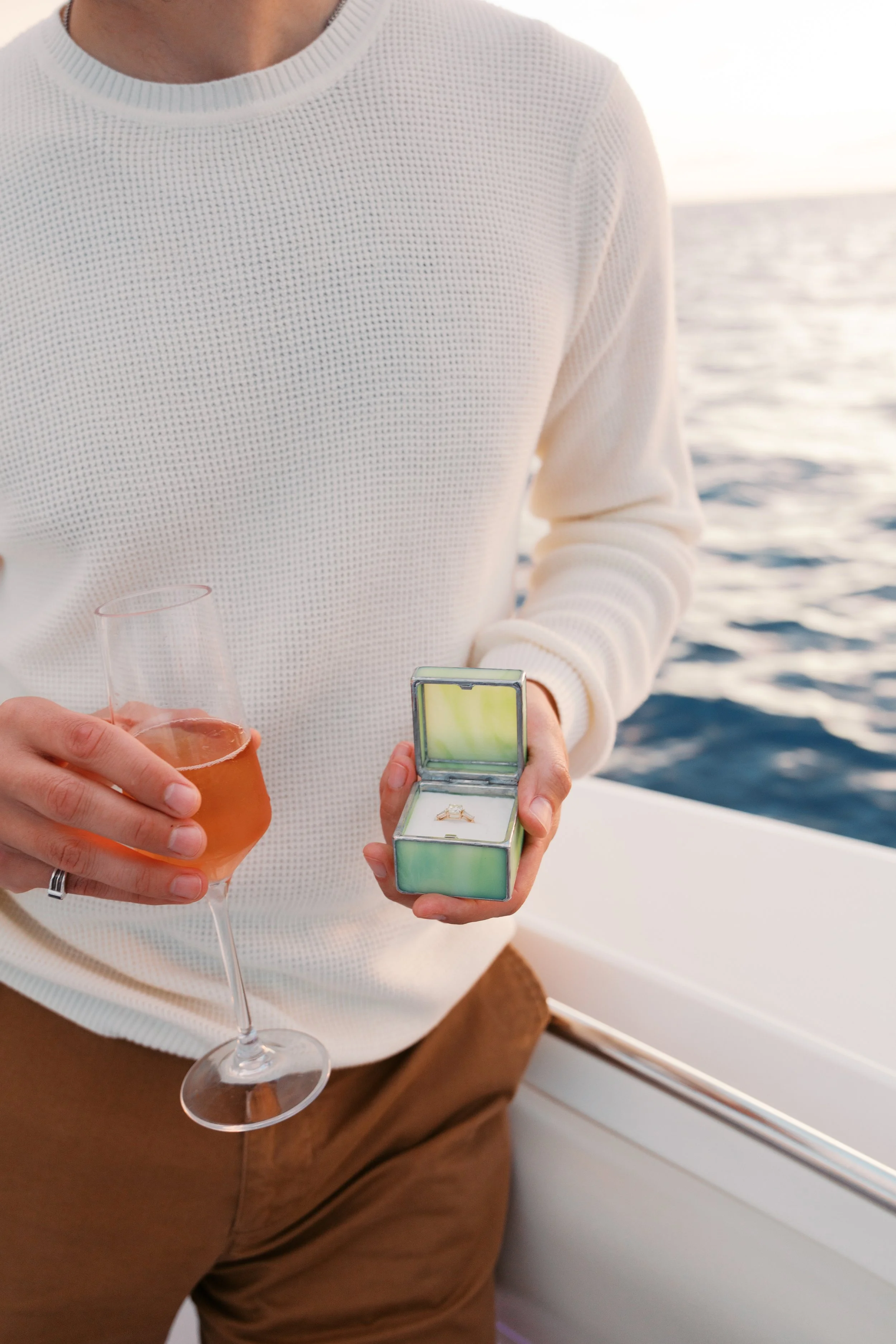 Sunset was at 6:01, and I was to propose at 5:45. With about ten minutes to go, I went back to the cabin to get the ring. While back there, the crew member hesitantly mentioned that she was a photographer and that she brought her camera on board. She said, “I know you said you wanted privacy, but I could get my camera out if you like and take some pictures afterwards.” How could I not say yes.